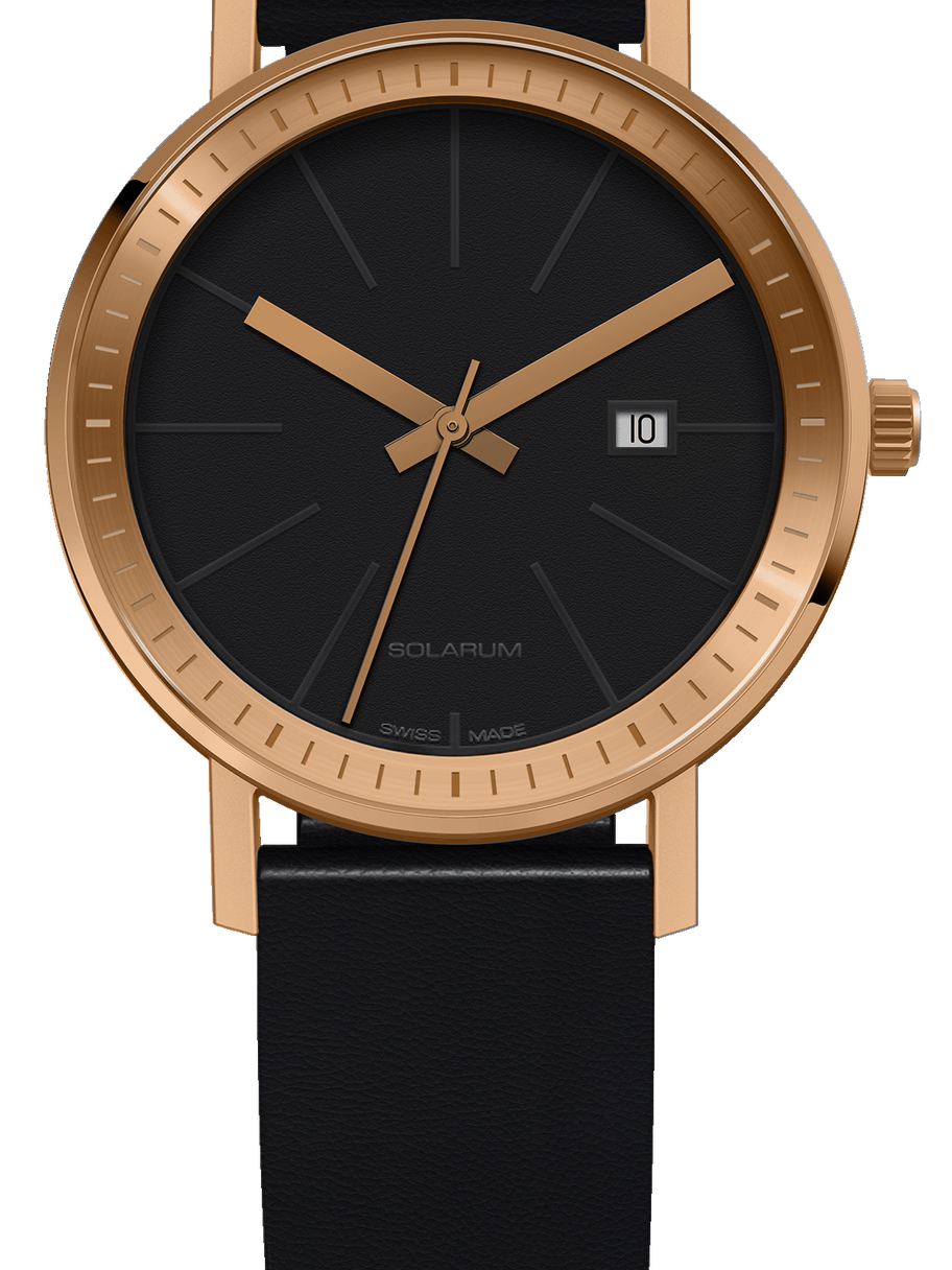 Das flache Gehäuse (Ø 40 mm, Höhe 8,5 mm) aus rotgoldfarbenem PVD-beschichtetem Edelstahl 316L liegt elegant am Handgelenk. Saphirglas schützt das schwarze Zifferblatt mit rotgoldenen Zeigern und schwarzem Druck – puristisch und edel.